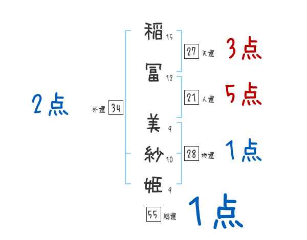 天運![]() | 稲冨美紗姫さんの天運は27画の3つ星!頭脳明晰だが強情で摩擦が多い傾向。孤立に注意。 家系が持つ宿命的な運勢を表します。祖先から受け継いだ苗字ですので自分の力が及びません。家柄を象徴します。 |