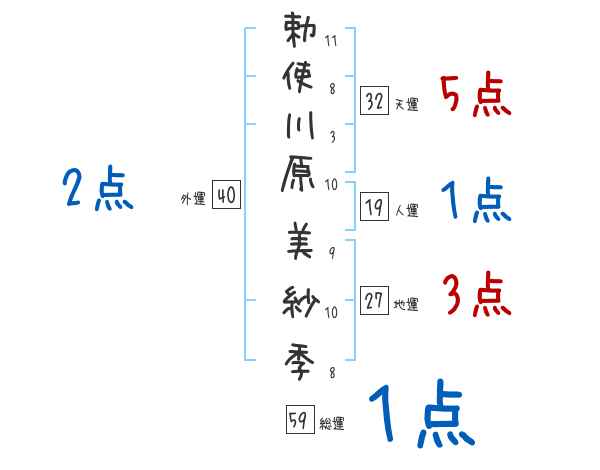 天運![]() | 勅使川原美紗季さんの天運は32画の5つ星!柔軟性があり成功する。チャンスが多く金運が良い。 家系が持つ宿命的な運勢を表します。祖先から受け継いだ苗字ですので自分の力が及びません。家柄を象徴します。 |