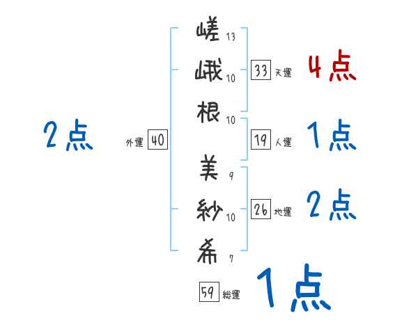 天運![]() | 嵯峨根美紗希さんの天運は33画の4つ星!権力志向でプライドが高い。勇気があり運を切り開き成功する。 家系が持つ宿命的な運勢を表します。祖先から受け継いだ苗字ですので自分の力が及びません。家柄を象徴します。 |