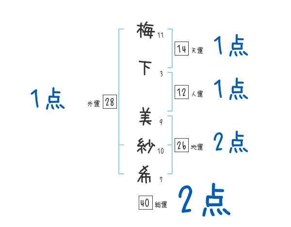 天運![]() | 梅下美紗希さんの天運は14画の1つ星!人に対して優しいがストレスを溜め込みがち。人間関係のトラブルを避けるよう気をつけましょう。 家系が持つ宿命的な運勢を表します。祖先から受け継いだ苗字ですので自分の力が及びません。家柄を象徴します。 |