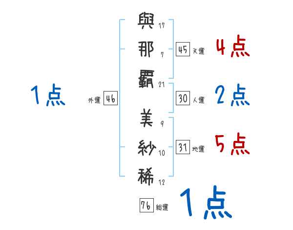 天運![]() | 與那覇美紗稀さんの天運は45画の4つ星!もくもくと物事を進め達成する。地味な努力家。 家系が持つ宿命的な運勢を表します。祖先から受け継いだ苗字ですので自分の力が及びません。家柄を象徴します。 |