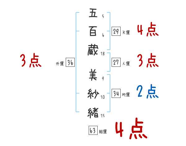 外運![]() | 五百蔵美紗緒さんの外運は36画の3つ星!先見性が豊かです。多少神経質で苦労することも。 生活面を象徴する運勢です。外部から受ける影響力を表し、結婚運、家庭運や職場、環境への順応性を表します。 |