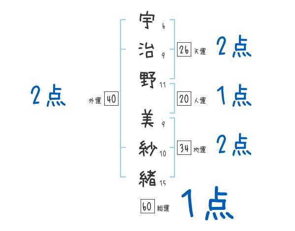 天運![]() | 宇治野美紗緒さんの天運は26画の2つ星!波瀾万丈かも。信頼できる人を大事にしましょう。 家系が持つ宿命的な運勢を表します。祖先から受け継いだ苗字ですので自分の力が及びません。家柄を象徴します。 |