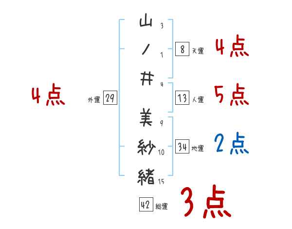 外運![]() | 山ノ井美紗緒さんの外運は29画の4つ星!完全主義で才能がある。厳格な心の持ち主。 生活面を象徴する運勢です。外部から受ける影響力を表し、結婚運、家庭運や職場、環境への順応性を表します。 |