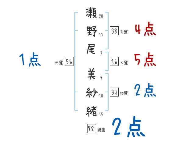 総運![]() | 瀬野尾美紗緒さんの総運は72画の2つ星!災難が多く不安定な生活にならないように注意。明暗のある人生かも。 あなたの人生を表す1番重要な運勢です。生涯を通じて影響する総合運となり、主に50歳以降の晩年期に影響を及ぼします。 |