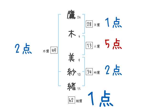 天運![]() | 鷹木美紗緒さんの天運は28画の1つ星!家庭環境に注意。スポーツで活躍できる能力があるかも。 家系が持つ宿命的な運勢を表します。祖先から受け継いだ苗字ですので自分の力が及びません。家柄を象徴します。 |