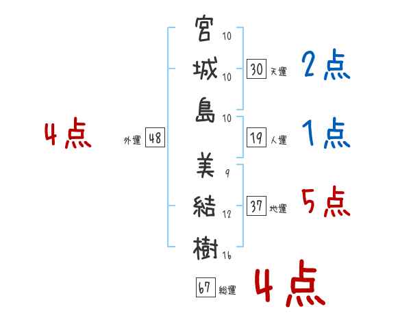 外運![]() | 宮城島美結樹さんの外運は48画の4つ星!賢明な性格で人望が厚い。指導力があり多くの人に尊敬される。 生活面を象徴する運勢です。外部から受ける影響力を表し、結婚運、家庭運や職場、環境への順応性を表します。 |