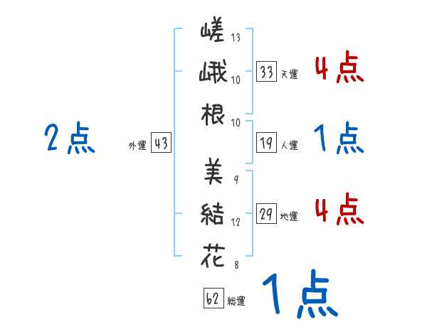 外運![]() | 嵯峨根美結花さんの外運は43画の2つ星!頑固な性格で独立心が強いかも。やや非現実的で浪費に注意しましょう。 生活面を象徴する運勢です。外部から受ける影響力を表し、結婚運、家庭運や職場、環境への順応性を表します。 |