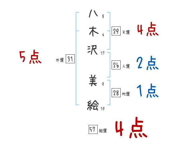 総運![]() | 八木沢美絵さんの総運は57画の4つ星!向上心があり人望がある。地位を得る。 あなたの人生を表す1番重要な運勢です。生涯を通じて影響する総合運となり、主に50歳以降の晩年期に影響を及ぼします。 |