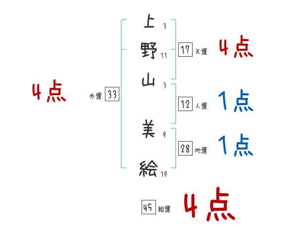外運![]() | 上野山美絵さんの外運は33画の4つ星!権力志向でプライドが高い。勇気があり運を切り開き成功する。 生活面を象徴する運勢です。外部から受ける影響力を表し、結婚運、家庭運や職場、環境への順応性を表します。 |