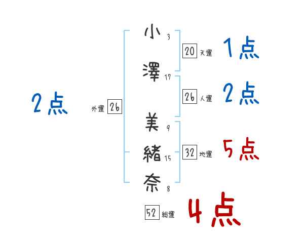 外運![]() | 小澤美緒奈さんの外運は26画の2つ星!波瀾万丈かも。信頼できる人を大事にしましょう。 生活面を象徴する運勢です。外部から受ける影響力を表し、結婚運、家庭運や職場、環境への順応性を表します。 |