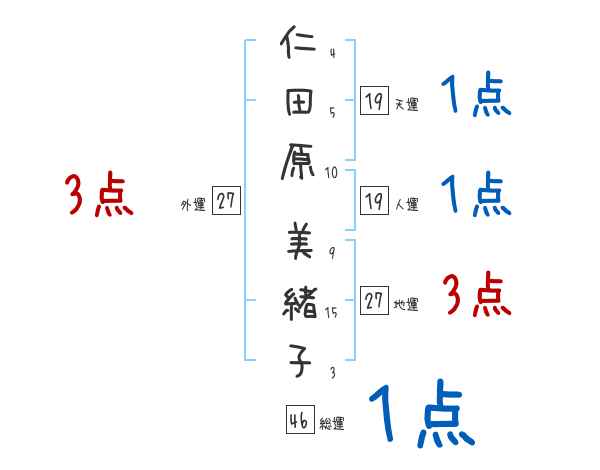 外運![]() | 仁田原美緒子さんの外運は27画の3つ星!頭脳明晰だが強情で摩擦が多い傾向。孤立に注意。 生活面を象徴する運勢です。外部から受ける影響力を表し、結婚運、家庭運や職場、環境への順応性を表します。 |