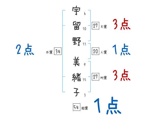 天運![]() | 宇留野美緒子さんの天運は27画の3つ星!頭脳明晰だが強情で摩擦が多い傾向。孤立に注意。 家系が持つ宿命的な運勢を表します。祖先から受け継いだ苗字ですので自分の力が及びません。家柄を象徴します。 |