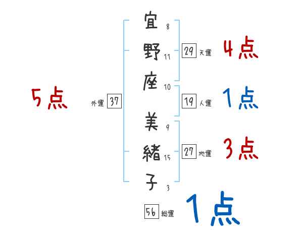総運![]() | 宜野座美緒子さんの総運は56画の1つ星!消極的で無気力になりがち。誠実な気持ちが必要でしょう。 あなたの人生を表す1番重要な運勢です。生涯を通じて影響する総合運となり、主に50歳以降の晩年期に影響を及ぼします。 |
