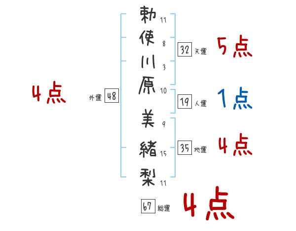 天運![]() | 勅使川原美緒梨さんの天運は32画の5つ星!柔軟性があり成功する。チャンスが多く金運が良い。 家系が持つ宿命的な運勢を表します。祖先から受け継いだ苗字ですので自分の力が及びません。家柄を象徴します。 |