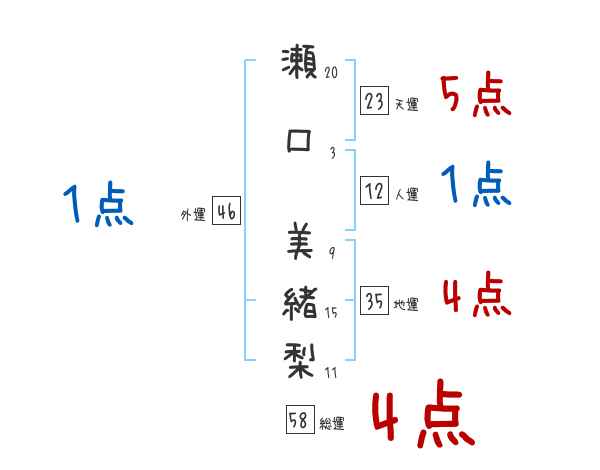 天運![]() | 瀬口美緒梨さんの天運は23画の5つ星!想像力に優れ活力がある。一代で成功し名誉を手に入れる。 家系が持つ宿命的な運勢を表します。祖先から受け継いだ苗字ですので自分の力が及びません。家柄を象徴します。 |