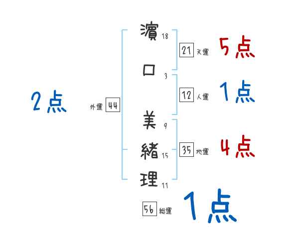 外運![]() | 濵口美緒理さんの外運は44画の2つ星!誠実で慎重な性格。物事を考えすぎないように注意しましょう。 生活面を象徴する運勢です。外部から受ける影響力を表し、結婚運、家庭運や職場、環境への順応性を表します。 |