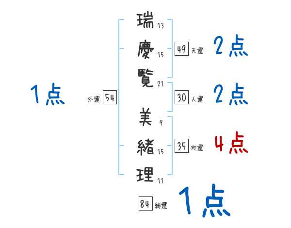 天運![]() | 瑞慶覧美緒理さんの天運は49画の2つ星!不安定な性格で明暗がある人生。周りの人には支援されやすい。 家系が持つ宿命的な運勢を表します。祖先から受け継いだ苗字ですので自分の力が及びません。家柄を象徴します。 |