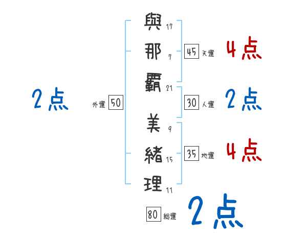 総運![]() | 與那覇美緒理さんの総運は80画の2つ星!病弱で健康に注意。多少苦労することがあるかも。 あなたの人生を表す1番重要な運勢です。生涯を通じて影響する総合運となり、主に50歳以降の晩年期に影響を及ぼします。 |