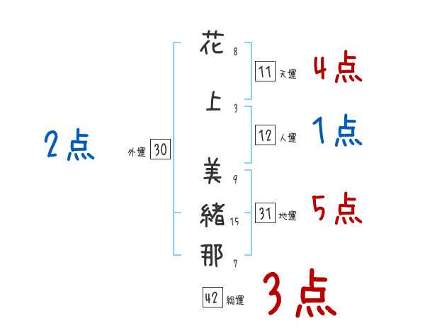 天運![]() | 花上美緒那さんの天運は11画の4つ星!着実に富や地位を得る幸運な人生。 家系が持つ宿命的な運勢を表します。祖先から受け継いだ苗字ですので自分の力が及びません。家柄を象徴します。 |