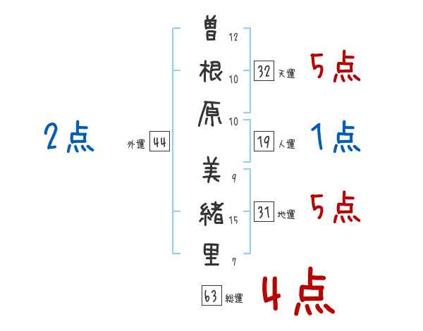 天運![]() | 曽根原美緒里さんの天運は32画の5つ星!柔軟性があり成功する。チャンスが多く金運が良い。 家系が持つ宿命的な運勢を表します。祖先から受け継いだ苗字ですので自分の力が及びません。家柄を象徴します。 |