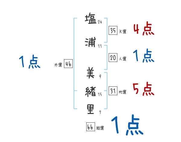 天運![]() | 塩浦美緒里さんの天運は35画の4つ星!温厚な性格で感受性が高い。穏和な性格で人望が厚い。 家系が持つ宿命的な運勢を表します。祖先から受け継いだ苗字ですので自分の力が及びません。家柄を象徴します。 |