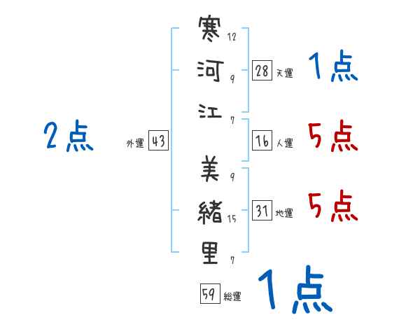 天運![]() | 寒河江美緒里さんの天運は28画の1つ星!家庭環境に注意。スポーツで活躍できる能力があるかも。 家系が持つ宿命的な運勢を表します。祖先から受け継いだ苗字ですので自分の力が及びません。家柄を象徴します。 |