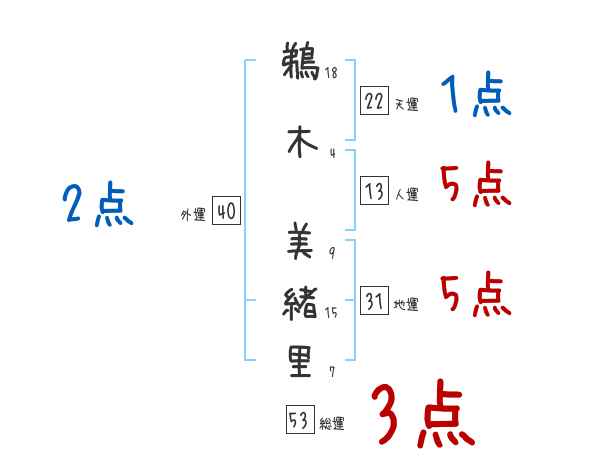 天運![]() | 鵜木美緒里さんの天運は22画の1つ星!努力することが苦手ないっぽう手先が器用。芸術性にも優れる。 家系が持つ宿命的な運勢を表します。祖先から受け継いだ苗字ですので自分の力が及びません。家柄を象徴します。 |
