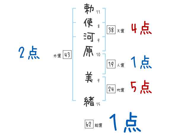 外運![]() | 勅使河原美緒さんの外運は43画の2つ星!頑固な性格で独立心が強いかも。やや非現実的で浪費に注意しましょう。 生活面を象徴する運勢です。外部から受ける影響力を表し、結婚運、家庭運や職場、環境への順応性を表します。 |