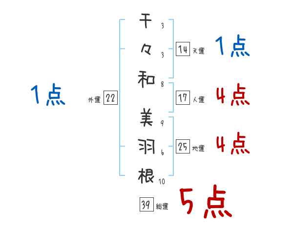 天運![]() | 千々和美羽根さんの天運は14画の1つ星!人に対して優しいがストレスを溜め込みがち。人間関係のトラブルを避けるよう気をつけましょう。 家系が持つ宿命的な運勢を表します。祖先から受け継いだ苗字ですので自分の力が及びません。家柄を象徴します。 |