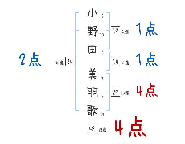 外運![]() | 小野田美羽歌さんの外運は34画の2つ星!独創性に優れるが、自尊心が強く災難に注意しましょう。 生活面を象徴する運勢です。外部から受ける影響力を表し、結婚運、家庭運や職場、環境への順応性を表します。 |