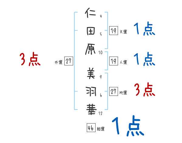 外運![]() | 仁田原美羽華さんの外運は27画の3つ星!頭脳明晰だが強情で摩擦が多い傾向。孤立に注意。 生活面を象徴する運勢です。外部から受ける影響力を表し、結婚運、家庭運や職場、環境への順応性を表します。 |