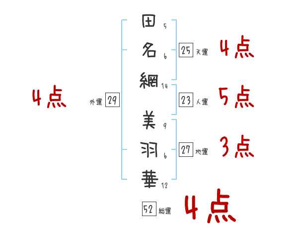 天運![]() | 田名網美羽華さんの天運は25画の4つ星!個性があり才能があふれる。強運の持ち主で発展する。 家系が持つ宿命的な運勢を表します。祖先から受け継いだ苗字ですので自分の力が及びません。家柄を象徴します。 |
