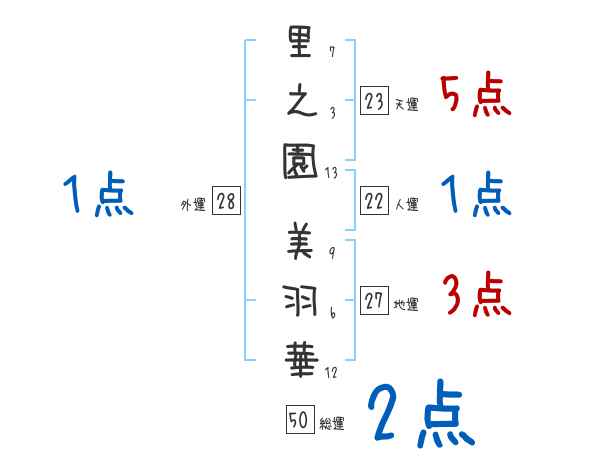 地運![]() | 里之園美羽華さんの地運は27画の3つ星!頭脳明晰だが強情で摩擦が多い傾向。孤立に注意。 個性を表す基礎的な運勢です。性格形成や対人関係、行動力など家庭環境に影響されます。主に誕生してから20歳くらいまでの若年期の運勢を表します。 |