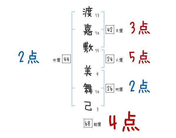 外運![]() | 渡嘉敷美舞己さんの外運は44画の2つ星!誠実で慎重な性格。物事を考えすぎないように注意しましょう。 生活面を象徴する運勢です。外部から受ける影響力を表し、結婚運、家庭運や職場、環境への順応性を表します。 |