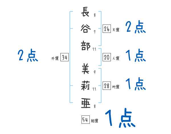 天運![]() | 長谷部美莉亜さんの天運は26画の2つ星!波瀾万丈かも。信頼できる人を大事にしましょう。 家系が持つ宿命的な運勢を表します。祖先から受け継いだ苗字ですので自分の力が及びません。家柄を象徴します。 |