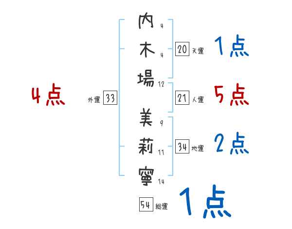 外運![]() | 内木場美莉寧さんの外運は33画の4つ星!権力志向でプライドが高い。勇気があり運を切り開き成功する。 生活面を象徴する運勢です。外部から受ける影響力を表し、結婚運、家庭運や職場、環境への順応性を表します。 |