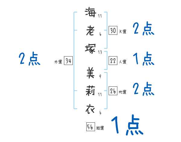人運![]() | 海老塚美莉衣さんの人運は22画の1つ星!努力することが苦手ないっぽう手先が器用。芸術性にも優れる。 性格や才能などを表す2番目に重要な運勢です。人間関係や協調性、社会的な成功に影響します。主に20歳から50歳ぐらいまでの中年期の運勢を表します。 |