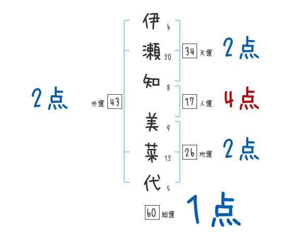 外運![]() | 伊瀬知美菜代さんの外運は43画の2つ星!頑固な性格で独立心が強いかも。やや非現実的で浪費に注意しましょう。 生活面を象徴する運勢です。外部から受ける影響力を表し、結婚運、家庭運や職場、環境への順応性を表します。 |