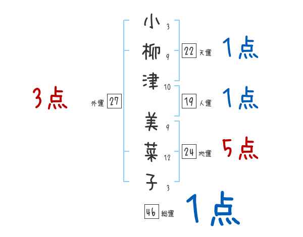 天運![]() | 小柳津美菜子さんの天運は22画の1つ星!努力することが苦手ないっぽう手先が器用。芸術性にも優れる。 家系が持つ宿命的な運勢を表します。祖先から受け継いだ苗字ですので自分の力が及びません。家柄を象徴します。 |