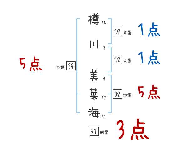 外運![]() | 樽川美菜海さんの外運は39画の5つ星!社交性に優れ人望が厚い。人の上に立ち成功する。 生活面を象徴する運勢です。外部から受ける影響力を表し、結婚運、家庭運や職場、環境への順応性を表します。 |