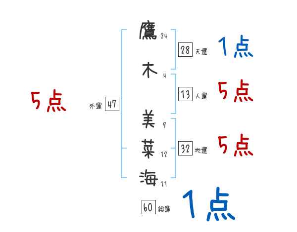 天運![]() | 鷹木美菜海さんの天運は28画の1つ星!家庭環境に注意。スポーツで活躍できる能力があるかも。 家系が持つ宿命的な運勢を表します。祖先から受け継いだ苗字ですので自分の力が及びません。家柄を象徴します。 |