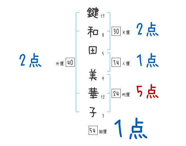 天運![]() | 鍵和田美華子さんの天運は30画の2つ星!浮き沈みの激しさに注意しましょう。 家系が持つ宿命的な運勢を表します。祖先から受け継いだ苗字ですので自分の力が及びません。家柄を象徴します。 |