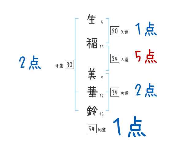 外運![]() | 生稲美華鈴さんの外運は30画の2つ星!浮き沈みの激しさに注意しましょう。 生活面を象徴する運勢です。外部から受ける影響力を表し、結婚運、家庭運や職場、環境への順応性を表します。 |