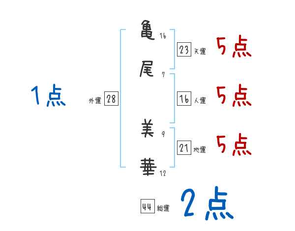 人運![]() | 亀尾美華さんの人運は16画の5つ星!人望が厚く大きく発展する。逆転成功が見える。 性格や才能などを表す2番目に重要な運勢です。人間関係や協調性、社会的な成功に影響します。主に20歳から50歳ぐらいまでの中年期の運勢を表します。 |