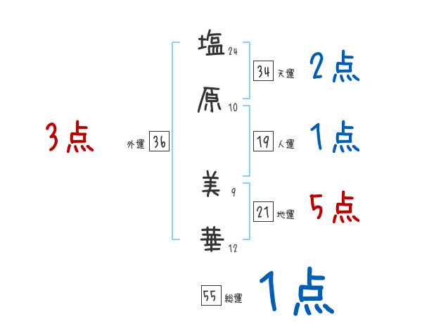 天運![]() | 塩原美華さんの天運は34画の2つ星!独創性に優れるが、自尊心が強く災難に注意しましょう。 家系が持つ宿命的な運勢を表します。祖先から受け継いだ苗字ですので自分の力が及びません。家柄を象徴します。 |