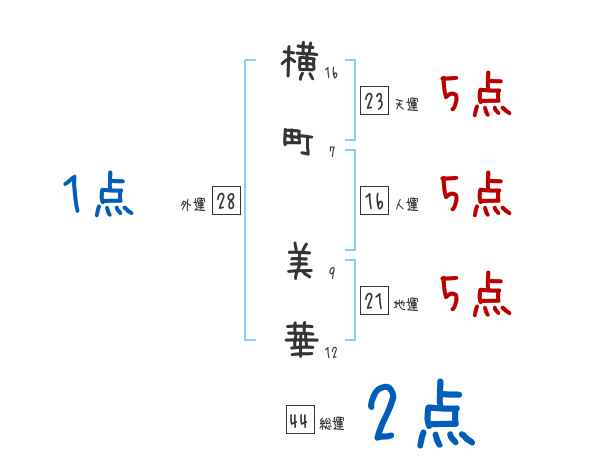 人運![]() | 横町美華さんの人運は16画の5つ星!人望が厚く大きく発展する。逆転成功が見える。 性格や才能などを表す2番目に重要な運勢です。人間関係や協調性、社会的な成功に影響します。主に20歳から50歳ぐらいまでの中年期の運勢を表します。 |