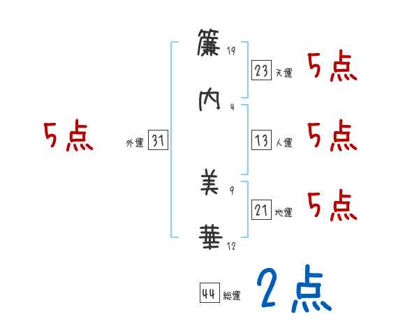 天運![]() | 簾内美華さんの天運は23画の5つ星!想像力に優れ活力がある。一代で成功し名誉を手に入れる。 家系が持つ宿命的な運勢を表します。祖先から受け継いだ苗字ですので自分の力が及びません。家柄を象徴します。 |