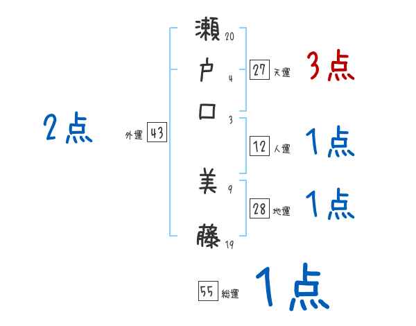 外運![]() | 瀬戸口美藤さんの外運は43画の2つ星!頑固な性格で独立心が強いかも。やや非現実的で浪費に注意しましょう。 生活面を象徴する運勢です。外部から受ける影響力を表し、結婚運、家庭運や職場、環境への順応性を表します。 |