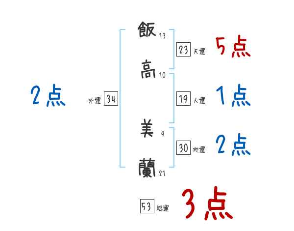 総運![]() | 飯高美蘭さんの総運は53画の3つ星!やや見栄っ張りで虚栄心がある。散財に注意。 あなたの人生を表す1番重要な運勢です。生涯を通じて影響する総合運となり、主に50歳以降の晩年期に影響を及ぼします。 |